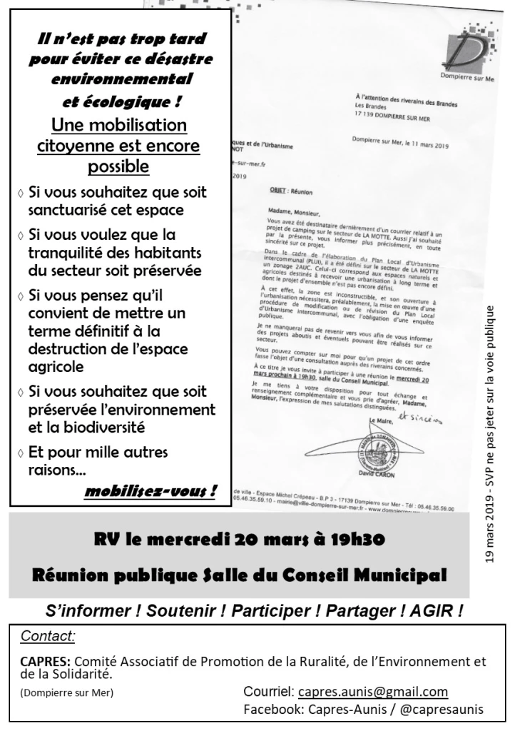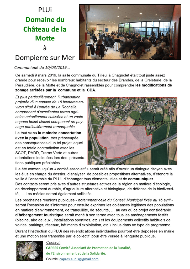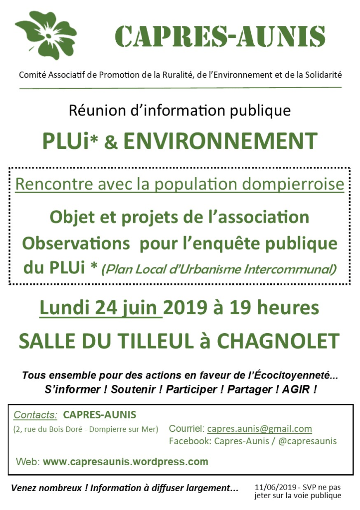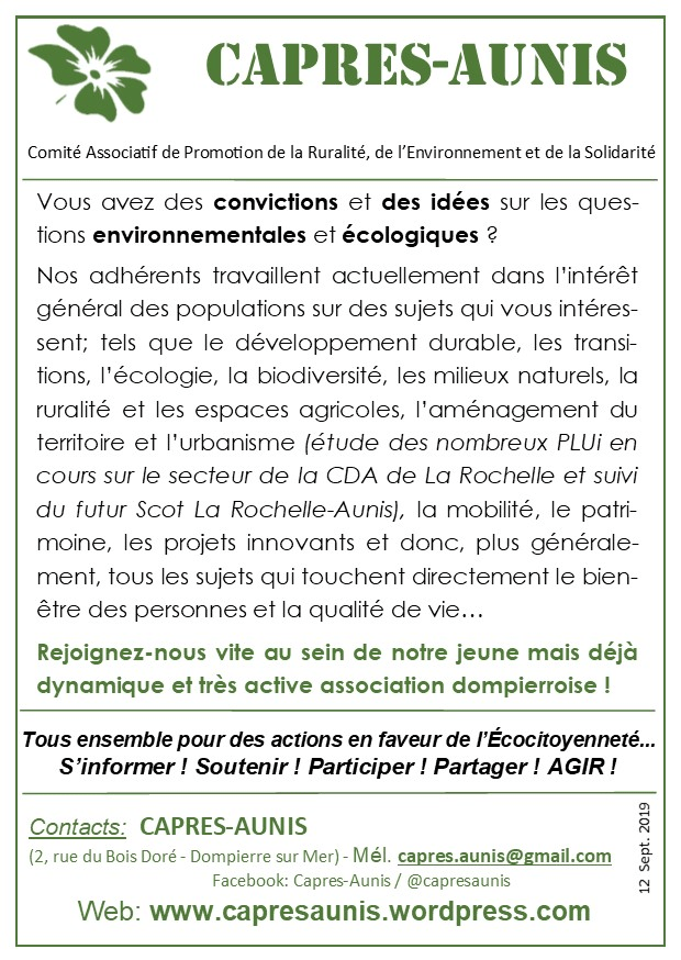 25/04/2019 Une cinquantaine de personnes étaient présentes hier soir lors de cette rencontre organisée par CAPRES-AUNIS. Elles ont pu prendre connaissance des objectifs écocitoyens de l’association et profiter des investigations effectuées dans le dossier PLUi où ont été relevées un grand nombre d’anomalies et d’erreurs d’appréciation qui seront portées à la connaissance des décideurs dans le cadre de l’enquête publique en cours. Vous aussi vous pouvez apporter votre contribution afin que des modifications interviennent pour améliorer la réglementation…
