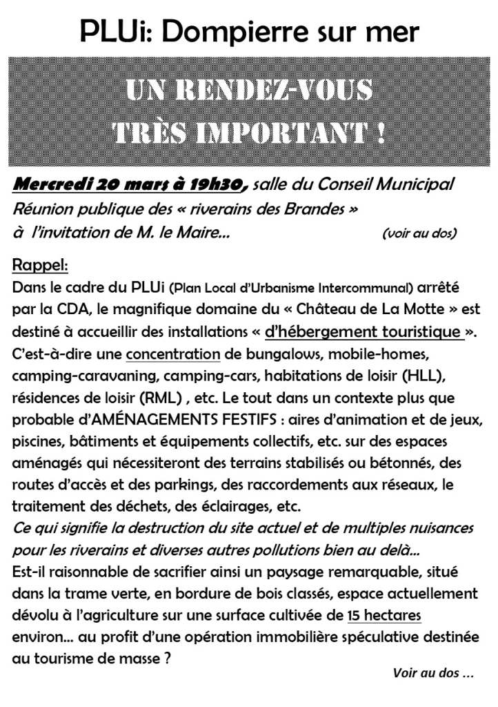 À noter que différentes demandes ont été incluses en vue de modifications ponctuelles par la CDA de La Rochelle (exemple: retour en zone Ap du Domaine du Château de la Motte prévu en « hébergement touristique » mais aussi… suppression d’un Espace Boisé Classé à Bellecroix !)