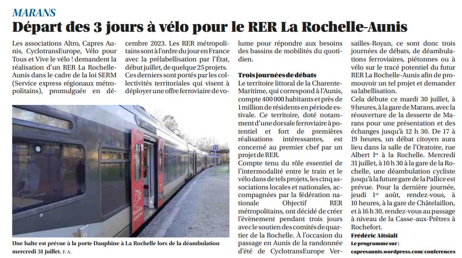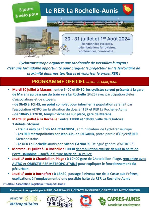 De Marans à La Rochelle, les 30/07, 31/07 et 1/08 manifestion coorganisée par ALTRO, CAPRES-AUNIS, OBJECTIF RER METROPOLITAIN et CYCLOTRANSEUROPE