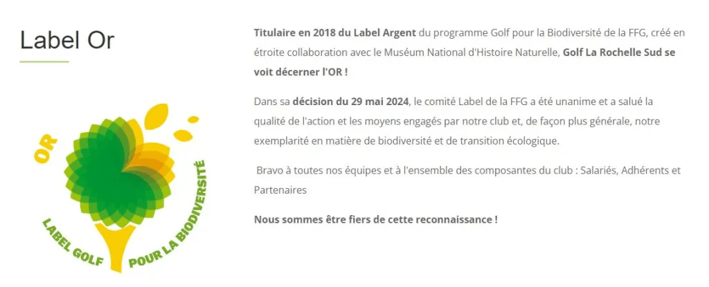 « Actif à l’Inventaire National du Patrimoine Naturel, le Golf La Rochelle Sud, en collaboration avec la LPO et l’appui scientifique du Muséum National d’Histoire Naturelle, a reçu le label Argent FFgolf pour sa contribution au programme golf pour la biodiversité. »