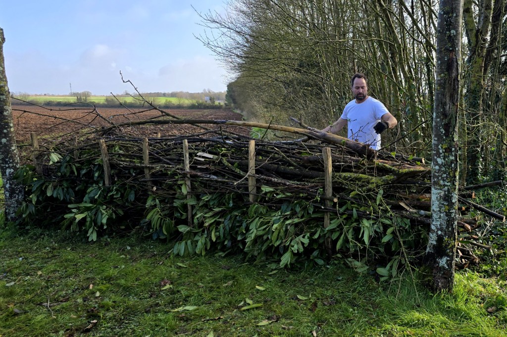 Mais heureusement, l’excellent plan B mis en place par Édouard et Audrey NORMANDIN a permis au premier chantier participatif organisé le samedi 22 février de construire 3 haies sèches (Haies de Benjes) sur une vingtaine de mètres en clôture de la parcelle agricole, avec la collaboration active de 36 participants, très motivés par l’objectif du Vignoble rochelais bio et la convivialité du groupe réuni sous un soleil printanier, au domaine de la Péraudière.